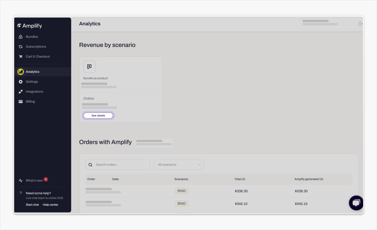 With Analytics, you can track key metrics related to your application, including bundle sales, revenue generated per scenario and orders that include one of our scenarios or features. It provides insights into how bundles perform, customer purchasing behaviors, and overall business performance.