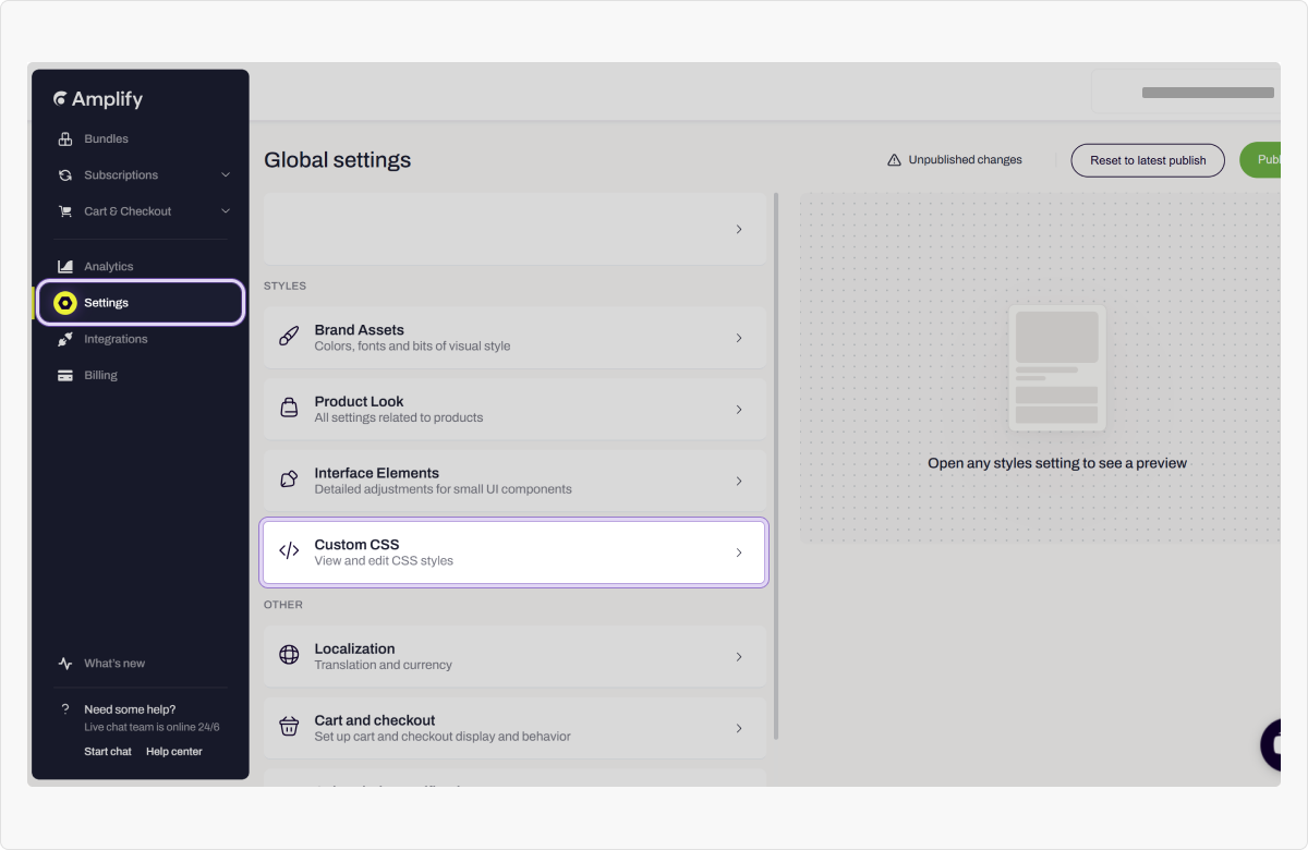 When in **Amplify | Power Slide Cart**, navigate to Settings and then click on Custom CSS.